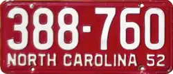 1952 | Embossed white serial on red plate; "NORTH CAROLINA 52" at bottom | none | 123-456 | 100-001 to 760-000 |