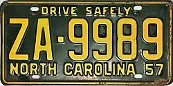 1957 | Embossed golden yellow serial on black plate with border line; "NORTH CAROLINA 57" at bottom | "DRIVE SAFELY" centered at top | A-1234 AB-1234 |