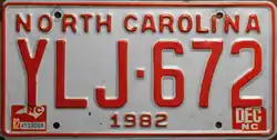- ^ a b c d e Tanner, Eric N. "North Carolina Passenger License Plates". allaboutlicenseplates.com. Retrieved November 19, 2020.