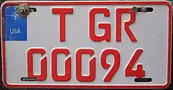 At the end of 2008 the US Forces started to introduce a new plate for temporary registration of vehicles (transfer plates). The small-size version with the blue strip "USA" and NATO insignia is in use. The red letters are in FE-style and the code follows the format "T xx yyyyy". The "T" happens to be short for either "temporary" or "transfer", but was primarily chosen because it is not used by any German registration district, therefore avoiding overlaps with actual German plates. The "xx" is the code for the local headquarters and "yyyyy" a 5-digit serial number filled with zeros if necessary. This kind of plate carries no stickers.