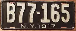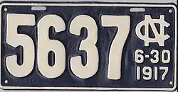 In 1917 South Carolina, Texas, and the U.S. Virgin Islands joined the list of states and territories providing license plates to vehicle owners, and no new states entered the prestate era. There were now 47 states and 5 territories that were issuing license plates and 1 other state requiring owners to provide their own license plates.[1][2][3][4]