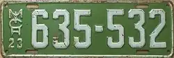Motorcycle | Embossed red serial on white plate; "W" over "23" at right | 1234 | 1 to approximately 2200 | ||
