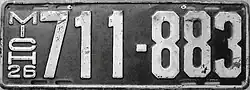 Motorcycle | Embossed black serial on cream plate; "W" over "26" at left | 1234A | 1 A to approximately 2100A | Used on regular motorcycles | |