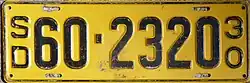 South Dakota | Embossed black lettering and rims on yellow base. "SD" embossed at left and "30" at right. | "none" | 123-456 | ||