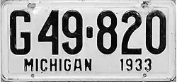 Michigan | Black on white, "MICHIGAN 1933" on bottom. | none | 1-234-567 | Issued in front and rear pairs. | |