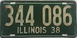 Illinois | Embossed white lettering on green base; "ILLINOIS 1938" at bottom. | none | 123 456 123 4567 |