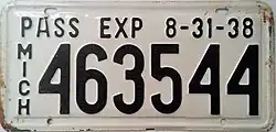 | Kansas | Embossed white numbers on black plate with border line; "KAN. '38" embossed in white block letters centered at bottom | none | 1-12345 10-1234 100-123 |
