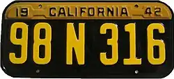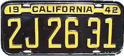 unknown | Embossed black-on-yellow "19 CALIFORNIA 42" renewal tabs to cover top lettering issued for wartime metal shortages. |
