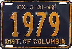 District of Columbia | Embossed yellow lettering and rims on black base. "DIST. OF COLUMBIA" or "DISTRICT OF COLUMBIA" embossed at bottom; "EX 3-31-42" at top. | none | 1234 12-345 123–456 |