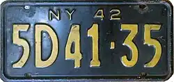 New York | Embossed golden yellow lettering on black base. "NY 42" embossed at top center. | none | 1A23-45 (and other formats) | County-coded. | |