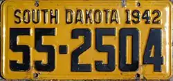 South Dakota | Jet-black lettering embossed on golden yellow base. "SOUTH DAKOTA 1942" embossed at top. | none | 1-12345 12-12345 |