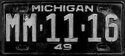 Michigan | White on black; "MICHIGAN" at top and "49" at bottom. | none | AB-12-34 | County-coded. Front and rear plates required. | |