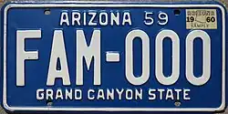 Arizona | Embossed white letters and rims on blue 1959 base. Renewal sticker for 1960 attached at top right. | GRAND CANYON STATE | ABC 123 | County-coded (ABC) | |