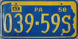 Oregon | Embossed gold numbers on blue plate with border line; "OREGON" embossed in gold block letters centered at top; month of expiration embossed in top left corner | "PACIFIC WONDERLAND" embossed in gold block letters at bottom | 1A-1234 | 1960 base plates revalidated for 1963 with stickers. Letter corresponds to month of expiration: letters N through Z (excluding O) were used for January through December respectively. | |