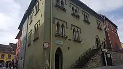 The Venetian House of Sighişoara[1] (Casa Venețiană in Romanian) was so called because of its stones framing the windows, which imitates the Venetian style. It dates back to the 16th century. The legend says that the Mayor of Sighișoara fell in love with a Venetian woman who he took in Sighișoara. They were happy but she missed her hometown so much that the mayor decided to bring her to Sighișoara by rebuilding the house and giving it a Venetian style.