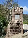 Casitas Vista Road at the east end of Foster Park Bridge | Ventura | 7/77 | Two large sandstone lions erected 1908 at entrance to Foster Park, a county park |