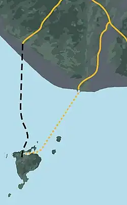 Black: possible tunnel route. Yellow: existing road and ferry routes.
