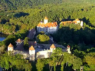 Veveří (Czech: hrad Veveří, German: Eichhorn) is an originally ducal and royal castle in Brno in the Czech Republic. It is located about 12 kilometres (7 mi) northwest of Brno city centre on the Svratka River.