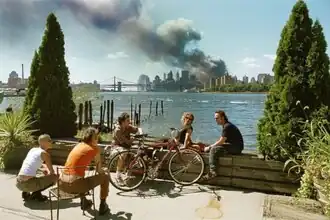 View from Williamsburg, Brooklyn, on Manhattan, 9/11 is a color photograph by German photographer Thomas Hoepker. It shows five people sitting on the banks of the East River in the Williamsburg neighborhood of the New York City Borough of Brooklyn while a cloud of smoke rises over Manhattan in the background. It emanates from the collapsed towers of the World Trade Center, which had been the target of a terrorist attack that day.