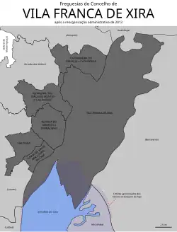 Vila Franca de Xira (European Portuguese pronunciation: [ˈvilɐ ˈfɾɐ̃kɐ ðɨ ˈʃiɾɐ] ), officially the City of Vila Franca de Xira (Portuguese: Cidade de Vila Franca de Xira), is a city and municipality in the Lisbon District in Portugal. The population in 2021 was 137,659,[1] in an area of 318.19 km2.[2]