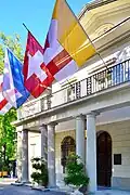 On occasion of the construction of the so-called linksufrige Seeuferbahn (literally: left lakeside railway) in 1872, the spacious estate lost the direct access to the lake. Alfred Escher died in 1882, and he inherited the estate to his daughter Lydia; after her suicide in 1891, the estate was the base to establish the Gottfried Keller Foundation and was bequeathed to the Swiss Confederation (Eidgenossenschaft). The Federal Council acted as the administrator of the foundation, and planned to sell the estate, to meet Lydia Escher's conditions attached to the gift. When this became known, prominent Zürich citizens formed a committee to save the park for the public use. As the city government was unable to raise the funds to purchase the estate, the citizens of Zürich bought shares to help rescue the park, and within a few days, the required capital was secured. To finance its maintenance, the Belvoirpark Society (Belvoirpark-Gesellschaft) sold several building plots along Seestrasse. In 1901, the city of Zürich was able to take over the property and thanked its citizens for preventing the appalling loss of the treasured estate. The villa was renovated in 1925 to house the Hotel and Hospitality School with an attached restaurant, known as Belvoir.[1] As of today, the villa also is used by the Wollishofen guild, but it primarily houses the restaurant Belvoir Park which is operated by the students of the hotel management school Belvoirpark Hotelfachschule.