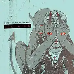 The cover art for Villains was designed by graphic artist Boneface, who designed the artwork for Queens of the Stone Age's previous album, ...Like Clockwork.[11] It was the first time that the band had returned to an artist to request artwork on a subsequent album. In an interview with the Juxtapoz magazine, Boneface talked about returning to create a cover for the album and his working relationship with Josh Homme. In the article he stated that, "Returning was honestly a pretty daunting task. People seemed to like all the artwork I did for the last album, so I felt I had something to live up to. Also, the fact that QOTSA tend to use a different artist for each album cover made it kind of special that they decided to use me again. I think Josh likened our relationship to Hunter S. Thompson and Ralph Steadman in the initial rallying call. So after I’d decided to plunge back into the QOTSA jacuzzi, I started work the way I usually do, just trying to create something cool. I did a bunch of preliminary drawings before I’d heard any new songs or we’d even talk about the album, and one of those sketches actually ended up being the basis for the album cover."[12] Each band member was given their own artwork, with Homme's on the front cover, and the rest of the band members on the back. An alternate vinyl cover that was released exclusively through independent record stores had a light blue tint over the image, gave Josh Homme a bloody nose, and the devil behind Homme giving two middle fingers.