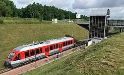 Vilnius Airport Railway Station is a railway station in Vilnius International Airport, Lithuania, which was opened on 2 October 2008. As for 2019, railbuses running between Vilnius Airport and Vilnius Central Station are the only passenger service of the station and are the fastest (7 min) and the cheapest (€0.80) way to go from the airport to the city centre, but there are only 7 trains during the day with intervals from 30 min to 5 h 45 min.[1][2] Vilnius airport is one of the two airports in the Baltic states to have a direct rail connection with the city centre (the other one being Tallinn Airport, which since September 2017 has a direct tram connection to Tallinn downtown (with intervals of 6 minutes, journey taking by 19 minutes).