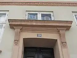 Vingårdstræde 19 is constructed with three storeys over a walk-out basement and is seven bays wide. The plastered facade is finished with a belt course above the ground floor and a modillioned cornice. The main entrance in the central bay is raised four steps from street level and topped by a hood mould supported by corbels. It is flanked by two basement entrances in the third and fifth bays. All the windows are accented with sills supported by corbels and between the five central bays of the two upper floors is a depressed rectangular band.[3]