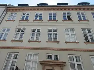 At the time of the 1840 census, the property was home to a total of 40 people distributed among seven households. Otto Kastrup, a collector at the Class Lottery, resided on the ground floor with his wife Marie Thofte, their daughter Henriette Kastrup and a maid.[11] Johan Frederik Møller, a portrait painter, resided in the other ground-floor apartment with his wife Emilie Albertine Martens, their three children (aged one to five), his mother-in-law Bolette Cæcilie Martens and one maid.[12] Johan Frederik Rauch, a musician in the Royal Danish Orchestra, resided on the first floor with his wife Ida Omoth, their three sons and a maid. The two eldest sons, Julius and Ferdinand, were also members of the Royal Danish Orchestra. The third son Carl was a carpenter.[13] Carl Weil, a corn doctor, resided in the other first-floor apartment with his wife Sara Aaronse, their two daughters (aged 23 and 27) and one maid.[14] Engel Maria Gulcke, the 73-year-old widow of a baker, resided on the second floor with her two unmarried daughters (aged 36 and 48), a 29-year-old grandson (a tanner) and a maid.[15] Johan Fraugott Sansky, another musician playing in the Royal Danish Orchestra, resided in the other second-floor apartment with his wife Caroline Sansky née Gerlach, their five children (aged eight to ten) and one maid.[16] Hans Peder Andresen, an innkeeper, resided in the basement with his wife Sophie Marie Svendsen, the courier Gravers Jensen (a lodger), Jensen's wife Karen Sørensen and innkeeper Anders Hansen Holm.[17]