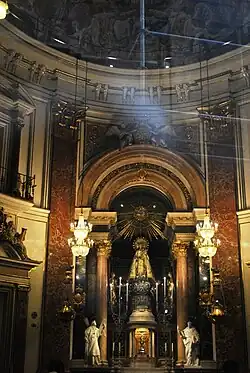 The basilica which now houses the image of 'Our Lady' was built on the site of a Roman temple. A renaissance arch leads from the basilica on Plaza de la Virgen to Valencia cathedral. Inside the basilica there is a Gothic style statue of The Virgin with two children at her feet. A mechanical device allows the statue to revolve. Antonio Palomino (1653 - 1726) painted the frescoes on the dome of the nave.[6]