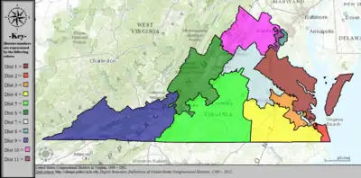 Virginia is currently divided into 11 congressional districts, each represented by a member of the United States House of Representatives.