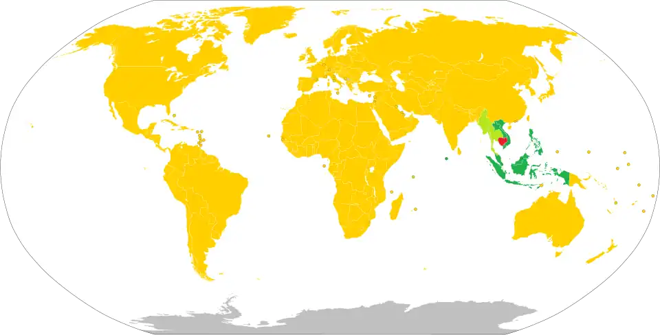 According to the Ministry of Foreign Affairs and International Cooperation of Cambodia, holders of ordinary passports of the following countries (including all ASEAN member states) may enter Cambodia without a visa for stays up to the duration listed:[3][4][5]