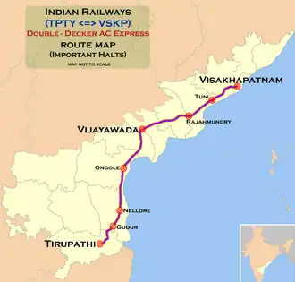 The 22707 / 22708 Visakhapatnam – Tirupati AC Double Decker Express is a superfast train belonging to South Coast Railways of Indian Railways connecting Visakhapatnam and Tirupati both in the Indian state of Andhra Pradesh.[1][2] as of now it is the only overnight intercity express operated in Indian Railways network and it is the longest operational Double Decker express of Indian Railways.