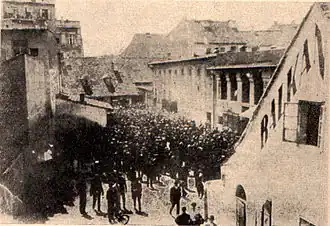 On 21 and 22 July, a general strike broke out in defense of the Hungarian Soviet Republic and Soviet Russia. Armed uprisings broke out in Maribor on 22 July and in Varaždin on 23 July, while in Osijek the uprising was prevented.[17] Mass arrests were carried out in late July and especially in early August.[18] Diamantstein was arrested in late July and proved to be the crown witness of the prosecution. Due to his testimony, which outlined all parts of the plan in great detail, 65 communists and sympathizers were prosecuted. The case came under public scrutiny and was followed closely by Miroslav Krleža, who attended court proceedings as a journalist reporting for the magazine Istina. The magazine was also implied in Diamantstein's testimony as being financed by Hungary, but Krleža was never prosecuted. Ćopić pleaded not guilty and continued to defend his support for the Hungarian Soviet Republic which he claimed was carried out solely through legal means.[19]