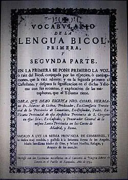 Lisboa, a Franciscan friar, resided in the Philippines from 1586 until 1618. He served in Ambos Camarines, where Bicol was widely spoken, from sometime between 1592 and 1602 until 1616. Lisboa died in Mexico in 1628.[1] The Vocabulario was first published posthumously in 1754. A second edition of the Vocabulario was published in 1865 under the expressed order of Bishop Francisco Gainza. It contained 10,495 (Bikol-Español) word entries in 417 pages using 22-inch (560 mm) x 33-inch (840 mm) paper and 5,588 entries in the (Español-Bicol) section in 103 pages. Realubit describes the Bicol vocabulary as "broad in social scale and localization", but criticizes Lisboa's presentation of grammatical tense, affixes, and parts of speech.[2]