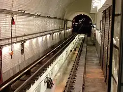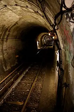 After serving as a training track for metro drivers, first on iron and then on rubber tires, and for the introduction of new rolling stock,[1] the voie navette to the north, near Pré-Saint-Gervais station, was converted into a reinforced inspection station, i.e. a small maintenance workshop for the MF 88 equipment on line 7 bis. The tunnel is partly used to park trains, with seven parking positions. In addition to a separation grid, the track still has its wooden tire tracks from the MP 51 trials.[9]
