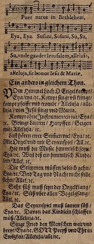 The song from the beginning of the Thirty Years' War may have been a reaction to the troubles of the war.[6] The melody was derived from a version of "Puer natus in Bethlehem" which appeared in 1616 in a hymnal in Paderborn.[7] Its Latin text was replaced by new poetry, while the repeated parts such as "Eia, susani" and "Alleluja" were kept.