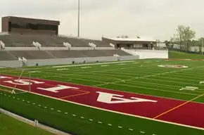 Thorne Stadium's amenities include a FieldTurf artificial playing surface[12] and a 36-foot by 19-foot Spectrum video scoreboard located in the north end of the stadium. There are also two air-conditioned dressing rooms, two training rooms, an officials’ dressing room and a conference room (all located in the adjoining M.O. Campbell Center arena in the south end of the stadium). Thorne Stadium's press box contains facilities for scoreboard/clock operation, TV/radio broadcasts, newspaper reporting, game filming and several coaches’ boxes.[13]