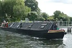 A converted working narrowboat, Clypeus, opens up leaving Penton Hook Lock heading upstream past the weir. Clypeus is number 28 in the Grand Union Canal Carrying Company fleet, being one of 12 iron composite pairs of Star Class boats built by Yarwoods of Northwich in 1935.