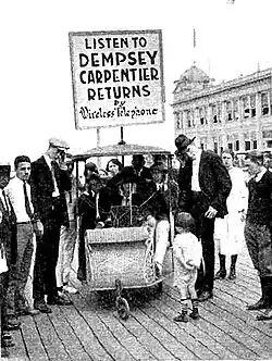 Meanwhile, fight promoters were looking for ways to improve the image of their sport and increase its popularity. In January 1921, a bout between Benny Leonard and Richie Mitchell at the Madison Square Garden arena in New York City was conducted as a benefit for the American Committee for Devastated France, working with philanthropist Anne Morgan, who was chair of that charity's executive committee.[5] Julius Hopp, manager of Madison Square Garden concerts, who helped coordinate the charity match, was on the lookout for additional opportunities. In March 1921 he was reportedly introduced to radio broadcasting, after being "impressed with the skill of New York amateur radio men as disclosed at the Second District Convention",[6] which was held at the Hotel Pennsylvania in New York City. One feature of this convention was that "music sent from the Bedloe Island Signal Corps Station [WVP][7] via radiofone was heard almost continuously".[8]