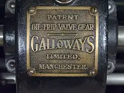 Before 1840 the firm had manufactured at least two steam engines, the first for Hayward of Yeovil, Somerset and the second for a mill in Glossop, Derbyshire. In that year they were successful in gaining much work in the manufacture of gas pipes and equipment for gasworks, a new and burgeoning industry. From 1842 until June 1847 the brothers were in partnership, as Galloways & Company, with Joseph Haley, in Manchester and Paris, as "Manufacturers of Patent Screw or Lifting Jacks, and as Patentees of Machines for cutting, punching and compressing Metals, and of the Rivets and other articles constructed by the said last-mentioned Machines ... [and] as Cotton Banding Manufacturers". In that month the partnership was dissolved and the Galloways continued to manufacture the machines and rivets in Manchester and Haley continued with the rivets in Paris. By 1856 they had six of these machines in their factory and manufactured two tons of rivets per machine per day, the devices being operated by one man and 20 boys.[28][29] An example of a wooden-bodied Galloway-Haley lifting jack is in Museo del Ferrocarril (railway museum) in Madrid. The patents were Haley's; for example, patent number 8768 of 31 December 1840 for an improved lifting jack and compressor.[25]