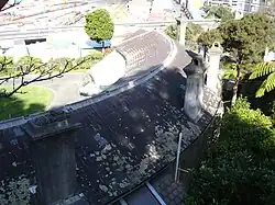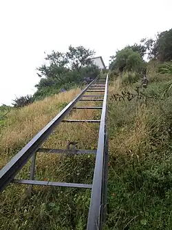 Wellington had a tramway system between 1878 and 1964. Wadestown was part of the network from 1911. The narrow and steep cutting that forms part of Lennel Road between Barnard Street and Sefton street was specifically created for the tramway.[18] In c. 1918 a tram shelter was built on the corner of Sefton Street and Hosking Lane/Lennel Road. It continues to be used as a bus shelter and is preserved for its architectural and historic value.[19] The Wadestown tram line was closed in 1949 and replaced by a bus service.[20][19]