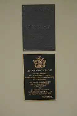 Wagga Wagga Civic Theatre is located in Wagga Wagga, New South Wales, Australia at the Wagga Wagga Civic Centre. It is adjacent to Wollundry Lagoon, art gallery and Wollundry Amphitheatre. The Civic Theatre opened in 1963. It was renovated in 1999/2000, opening again in May 2000. It underwent renovations again at the end of 2017 and the beginning of 2018. New chairs were installed, taking the seating capacity up by four - from 488 to 492. Wider seats were also added as well as a wheelchair lift for backstage.