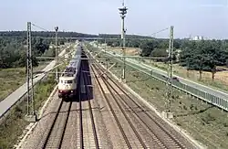 During the planning and construction, the track was divided for planning approval purposes into sections 4b (northern section, Philippsburg area) and 4c (southern section, Graben-Neudorf area). The new Mannheim–Stuttgart railway in the section from the entrance and exit to Graben-Neudorf was included in section 4a (Waghäusel).[5] In the mid 1970s, the entrance and exit tracks from the new line were designated as Überholbahnhof Oberhausen (Oberhausen crossing station) and the plans provided for overtaking movements.[6] Such overtaking was no longer envisaged in the planning in 1979.[7]