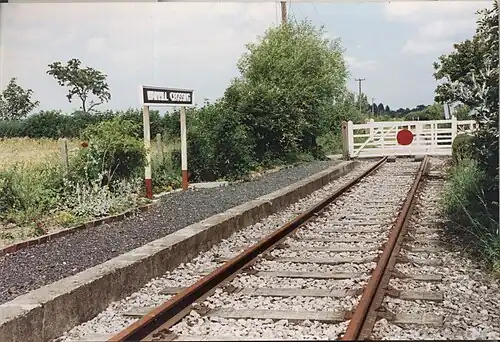 Opened in 1925, the halt - the last station to open on the line - sought to encourage passenger traffic in the face of increased competition from buses.[3] It was situated to the south of a level crossing over an unclassified road leading to Lower Wainhill and Hempton Wainhill. The lane saw very occasional traffic as it was unsuitable for motor vehicles and only served nine or ten houses on the eastern side of the Watlington and Princes Risborough Railway. A modest crossing keeper's cottage had been provided by the railway company which comprised two ground floor rooms and one bedroom on the first floor; there was no mains water, gas or electricity.[4] The crossing keeper was responsible for keeping the lamps alight on the gates and, once the station had opened, trimming and lighting the two oil hurricane lamps hung on posts to illuminate the single platform.[5]