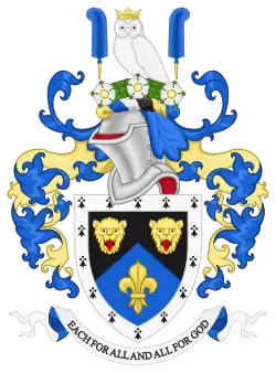 On a wreath Or, Azure, Argent and Sable, An owl Argent, crowned with an ancient crown Or, standing within a chaplet of leaves Proper and roses silver, barbed and seeded Proper, and between two pens Azure, the quills gold.