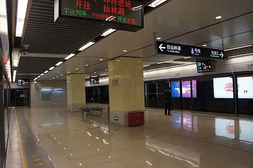 Wangjiawan station (simplified Chinese: 王家湾站; traditional Chinese: 王家灣站; pinyin: Wángjiāwān Zhàn), is a station on Line 4 of the Nanjing Metro that opened in January 2017 along with eighteen other stations as part of Line 4's first phase. The station is located underneath the T-intersection of Jiangwangmiao Avenue and Dongfang Road on an east–west axis and is within walking distance of Purple Mountain.[1] Originally named Jiangwangmiao Station during Line 4's planning phase, that name was later transferred to the immediately preceding station to the west.[2]