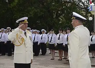 All warrant officers schools ceased their educational activity in the framework of the Serdyukov reform.[3] In 2013, new Minister of Defence Sergei Shoigu decided to restore the institution of warrant officers.[4][5] New staff complement, which included warrant officers positions, was approved in July of the same year. Warrant officers training began to be carried out by special educational divisions within the structure of higher military schools and academies.[6] The duration of studies extended to 2 years and 6–10 months. The admission became available not only for active duty enlisted personnel and non-commissioned officers (volunteers and conscripts) but also for civilian graduates of secondary schools who are directly commissioned into the warrant officer corps.[7]