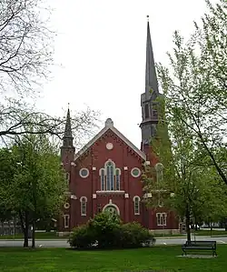 Christ Episcopal Church, is the architecturally superior of the two churches located on Washington Square. Found at the intersection of Lafayette and Columbus Streets, the church is opposite the Third District Appellate Courthouse.[2] The church was constructed in 1871 by the first Episcopalian congregation to organize itself in Ottawa; the congregation first held services in 1838.[2][6] The Episcopal Church was designed by architect A.H. Ellwood in the Gothic Revival style of the English Victorian era.[6][11] The building features a "Wallace Window" depicting the Resurrection. It was designed by German artist Julius Hübner.[12]