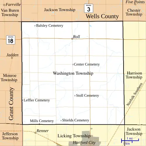 Washington Township is one of four townships in Blackford County, Indiana. As of the 2020 census, its population was 803 (down from 873 at 2010[4]) and it contained 364 housing units.[2] County Commissioners named the township after George Washington in 1833, and it was part of Jay County. In 1838, Washington Township became part of the newly organized Blackford County.[5]